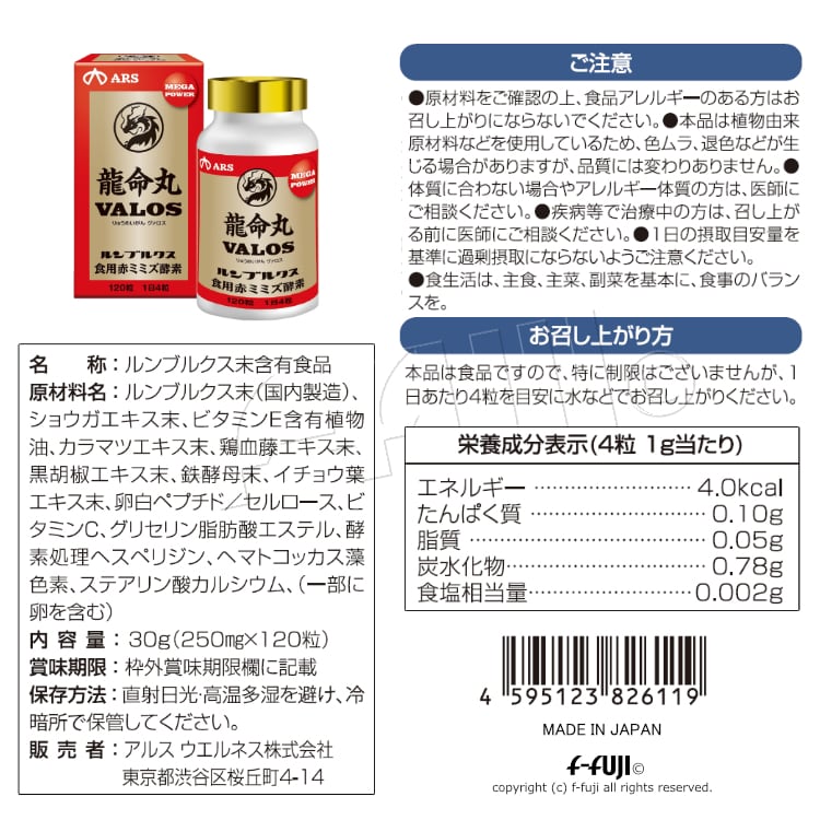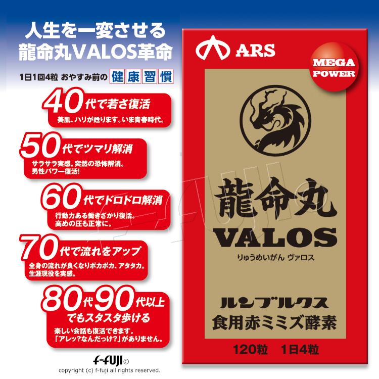 2箱セット 龍命丸 VALOS 250mgX120粒 血管力に特化した サプリメント ルンブルクス末 特許 サラサラ・シナヤカ・イキイキ シミ シワたるみ 送料無料 りゅうめいがん ヴァロス | HGH SHOP f-fuji